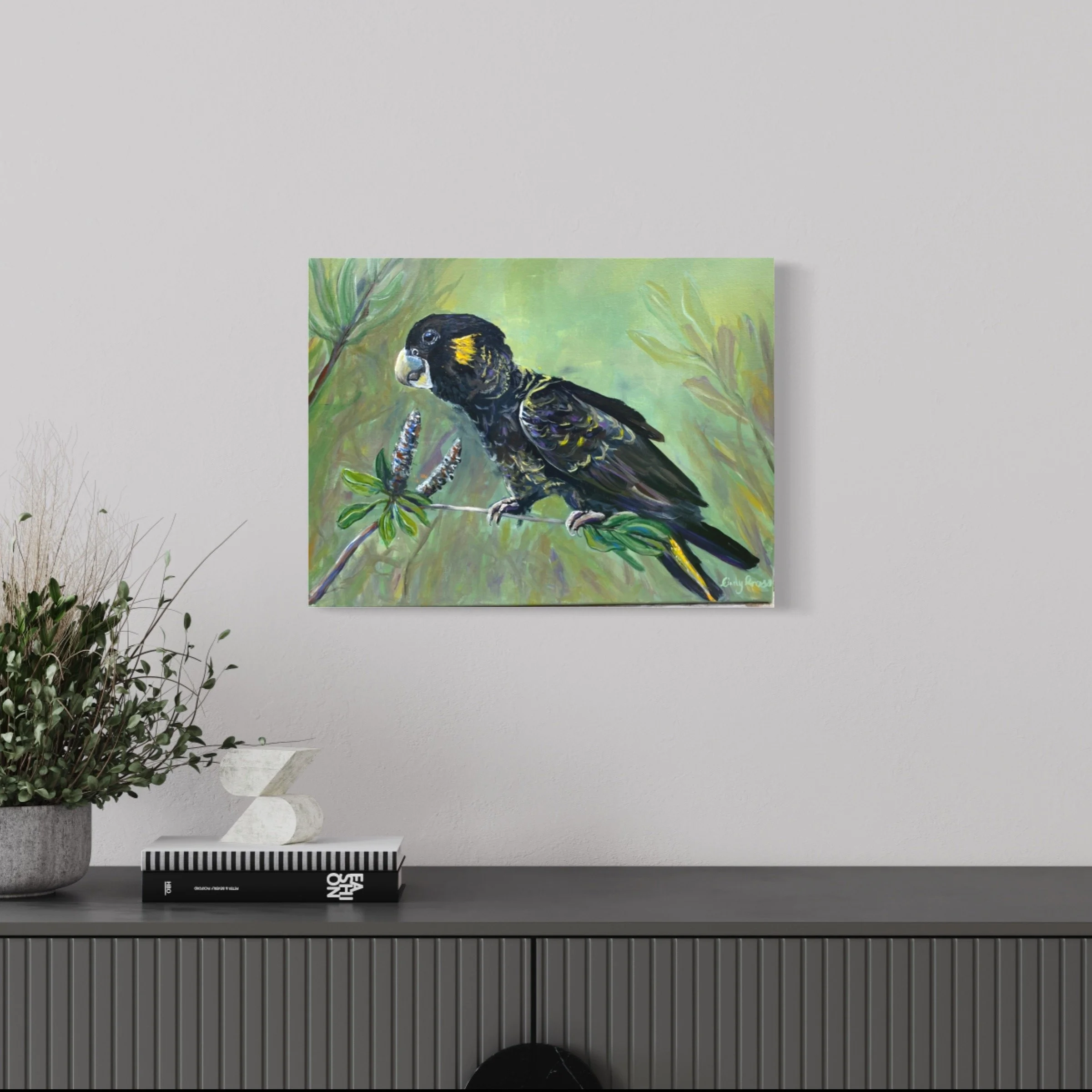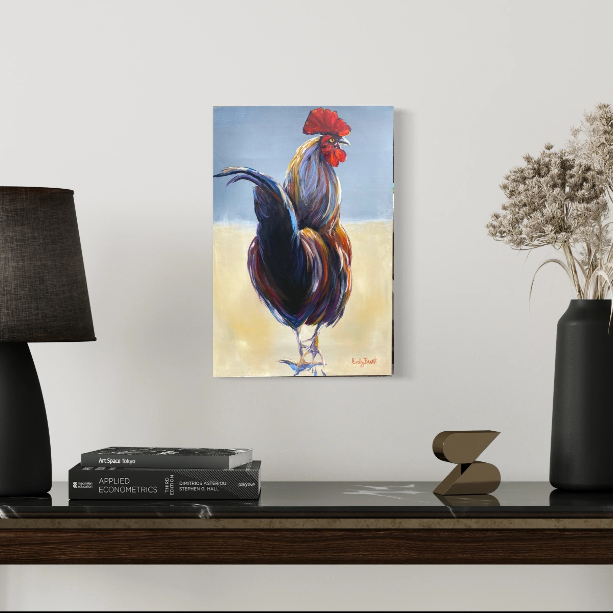 It measures 40cm x 50cm x 1.5cm. It’s acrylic on Canvas.
